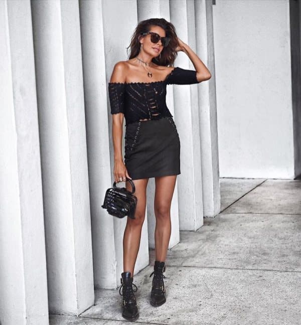 If you’re someone who prefers a bit more coverage, this next look is made for you. Stick with the leather jacket and pleated skirt idea, but go for a design that’s short without showing too much. Add a cute strap detail and some edgy rock-style boots and you’re all set for a night out with comfort and flair.