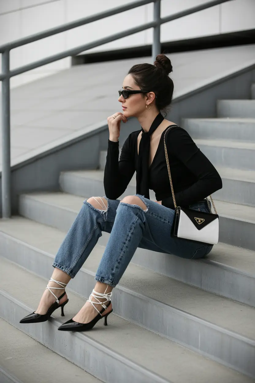 There’s something about an all-black look that never goes out of style. It’s slimming, elegant, and always on point. This one shows how to wear jeans on a night out while keeping things sleek. It’s the kind of outfit that easily transitions from season to season by swapping out shoes or outerwear.