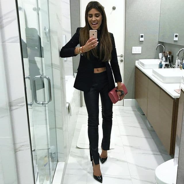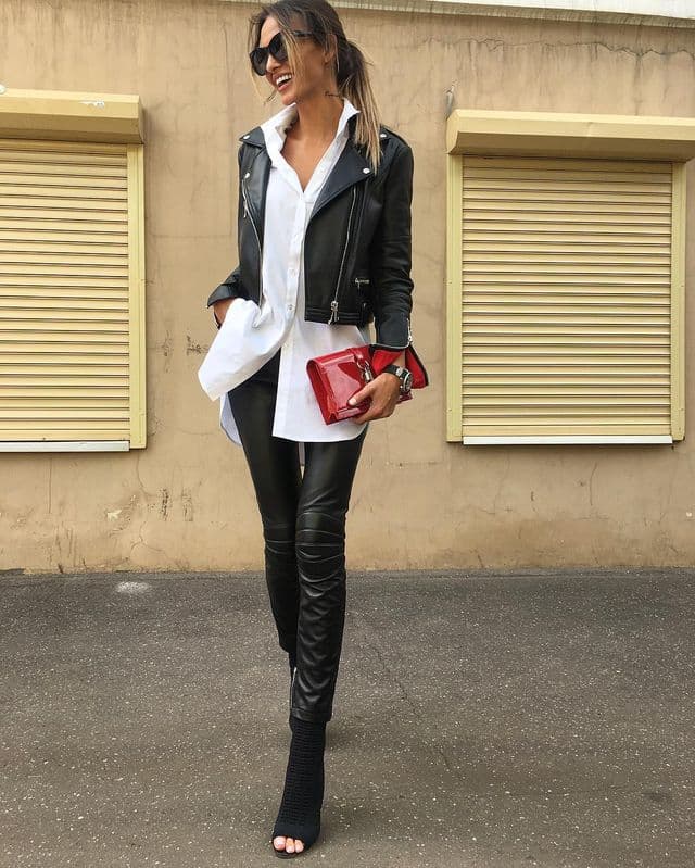 Still not done with leather pants? Try styling them with a crop top that shows just a little bit of skin. It’s a great way to highlight the work you’ve put in at the gym. An all-black base keeps things sleek and safe for any occasion. If you want to add a playful touch, carry a colorful purse to brighten up the look and turn a few heads.