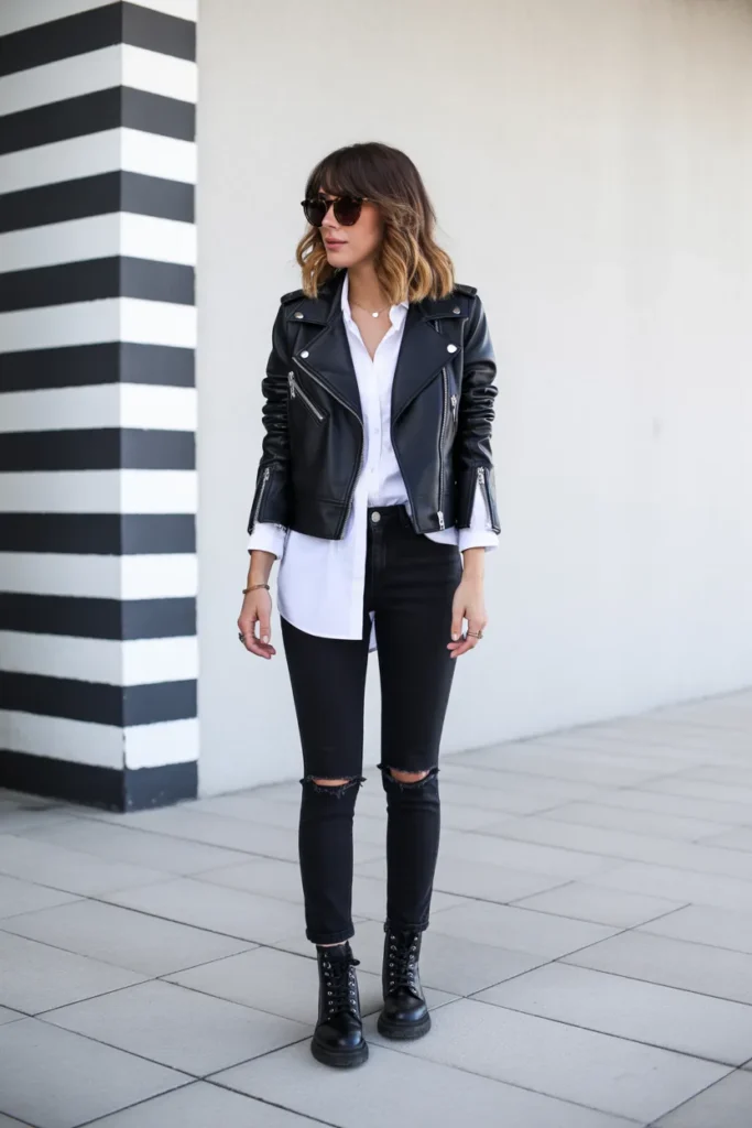 #14. A bold biker-inspired look with feminine touches
