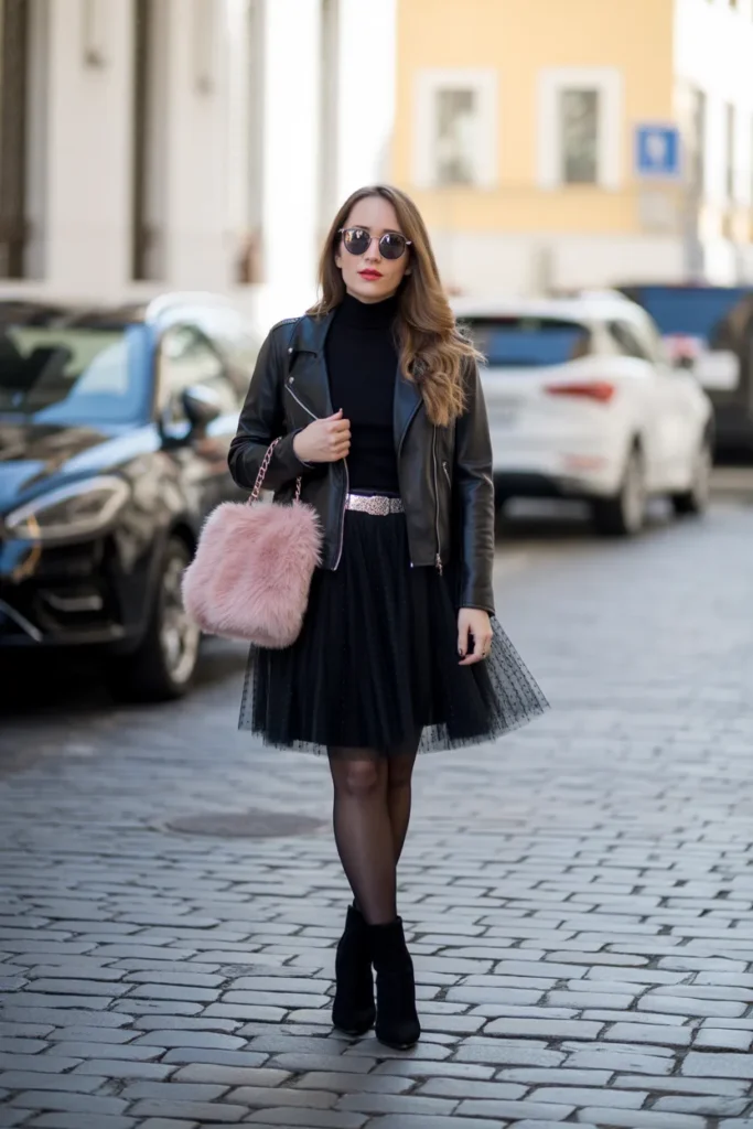 Leather is one of the standout textures for fall and winter, so don’t hold back. Start with a short black leather skirt as the base of your outfit, then layer a long-sleeve jacket over it. Choose either heels or boots depending on the vibe you’re going for. Either way, the look feels bold, balanced, and ready for the dance floor.