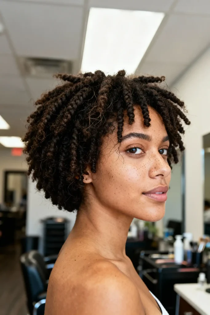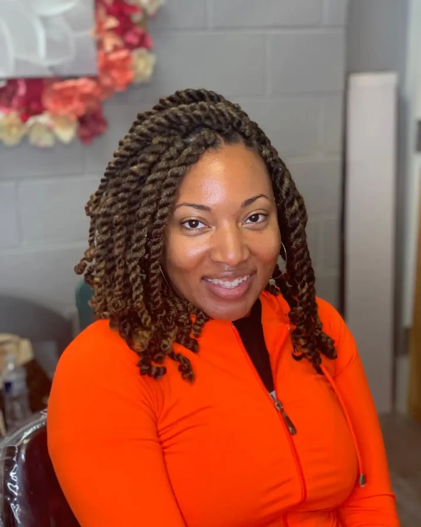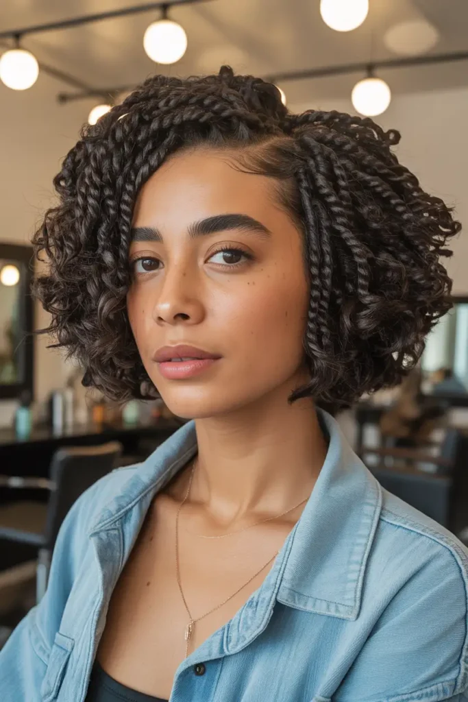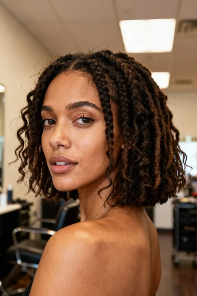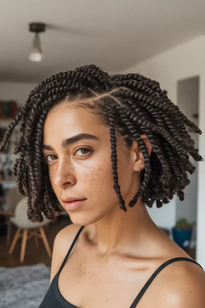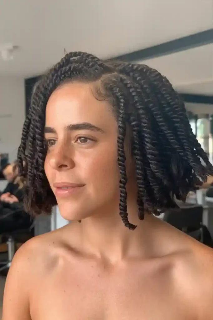 This look keeps the twists even and close to the head, giving a soft bob shape. I have seen this style work great for people who want something low effort but still polished. The twists sit naturally and do not need much daily styling. It is perfect if you like simple hair days.