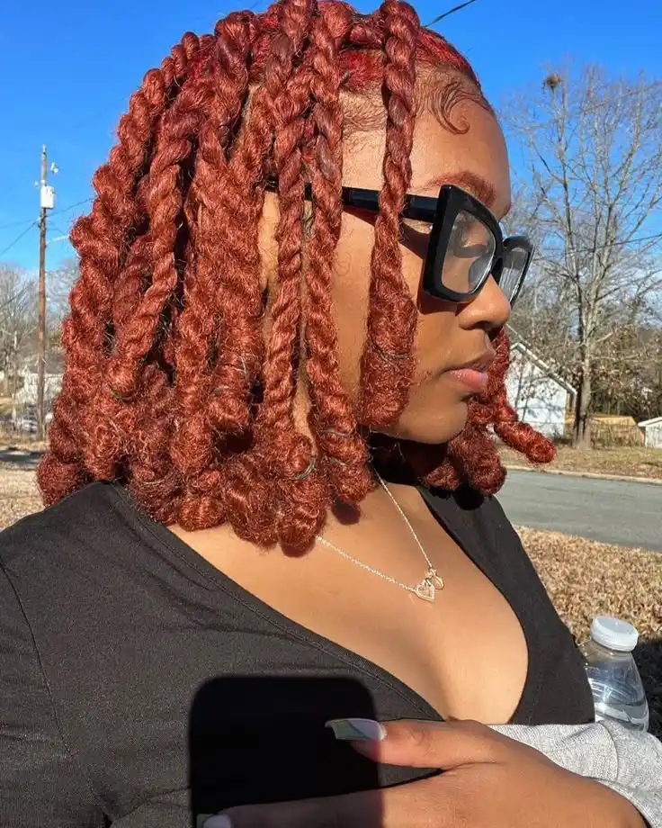 This copper tone adds warmth and makes the twists pop instantly. I find this style great for showing clean parts and neat twist work. The color brings life to the bob length without overpowering it. It is a solid option if you want something bold but still balanced.