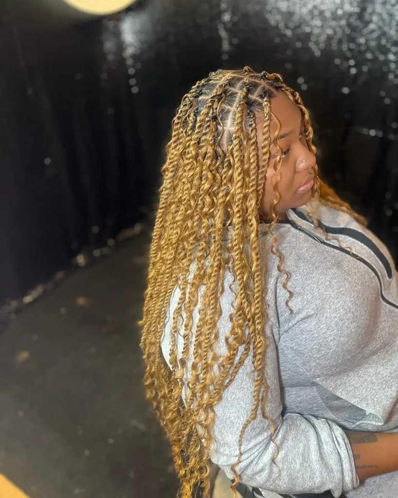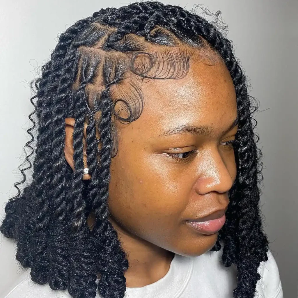 This style blends twists with natural curls for a relaxed finish. I personally like this look because it feels very real and wearable. The curls soften the twists and add texture around the ends. It is perfect if you want a natural vibe that still looks styled.