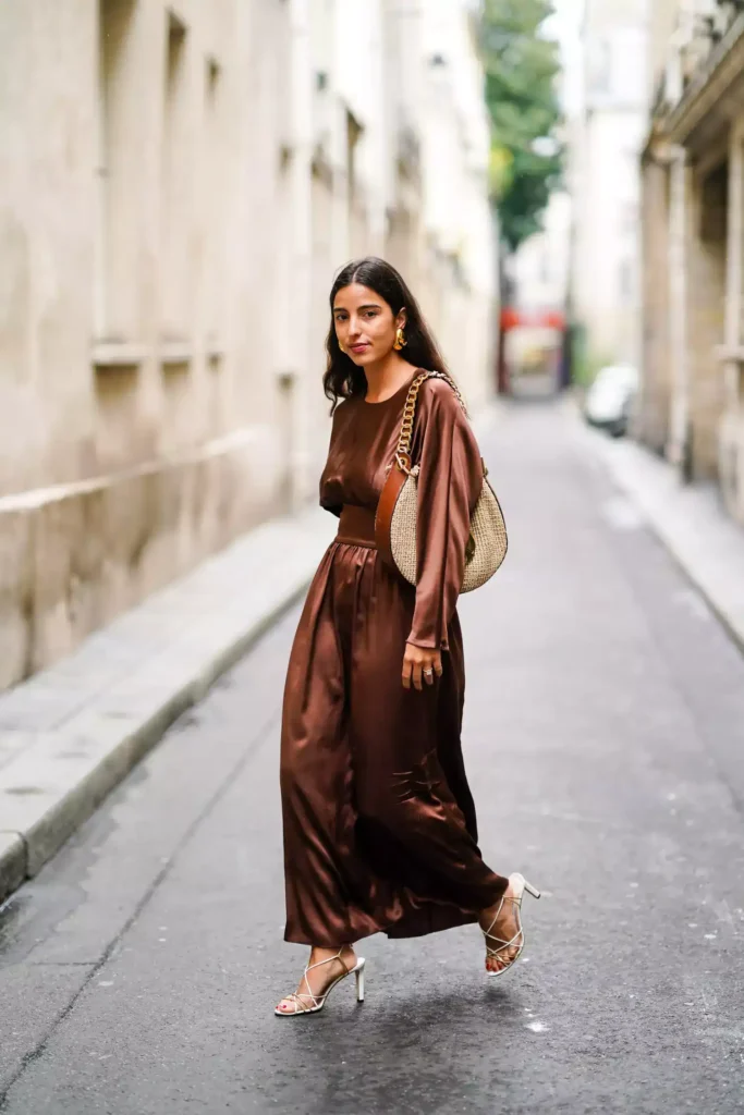 There’s something undeniably chic about a silky rust-toned dress. The delicate pearl detail at the back adds just the right amount of interest, turning a simple silhouette into something memorable. Style it with black strappy heels and a pulled-back bun for a refined look that feels elegant without trying too hard.