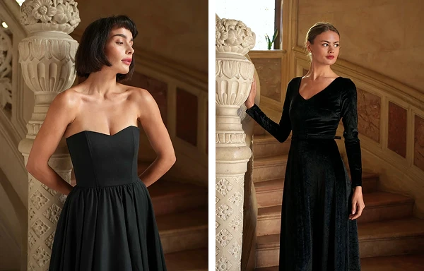 Whether you’re reaching for soft velvet or going bold with a strapless neckline, rich fabrics in deep tones always set the mood. These looks feel effortlessly elegant, with just enough structure to keep things feeling intentional. Add your favorite accessories and you’re ready to glow all evening long.