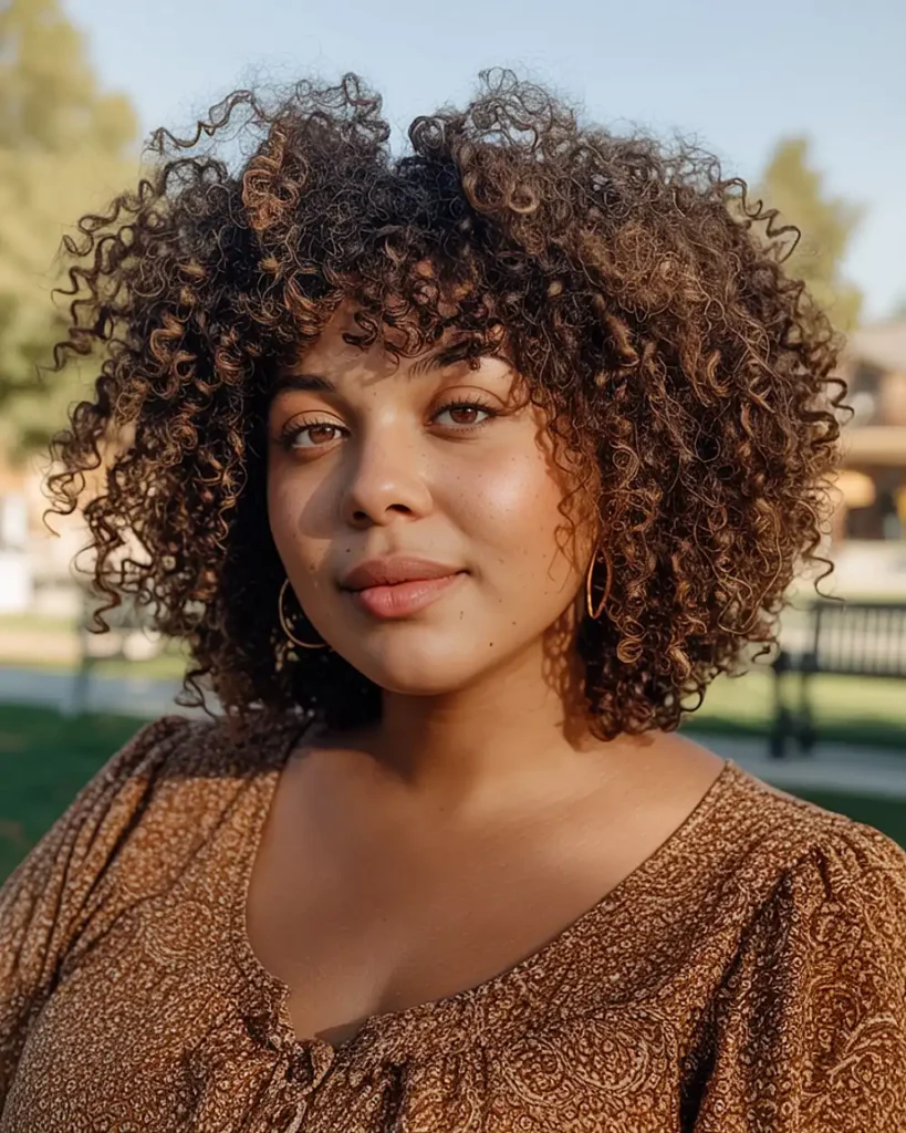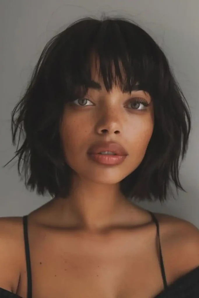 This French bob celebrates tight curls and natural volume. The fringe sits right at the front and adds shape without hiding the face. It feels bold yet very wearable. I love how this style lets curls be the main focus.