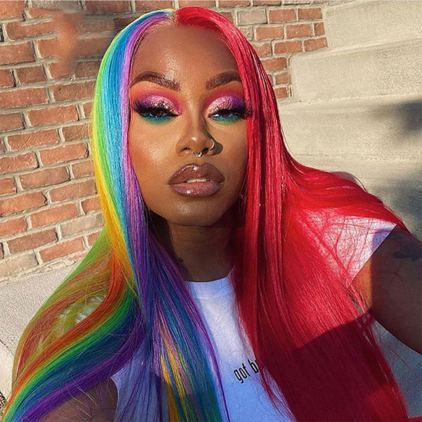If you love color and aren’t afraid to show it, this rainbow wig will be your new obsession. One side features vivid rainbow streaks while the other is a rich solid red, creating a look that’s fun, unique, and full of life.