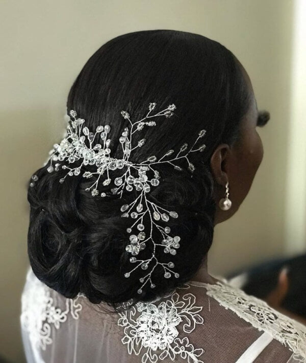 This romantic low bun is made for walking down the aisle in style. It’s smooth and sleek in the front with a large, elegant bun in the back that feels both classic and modern.