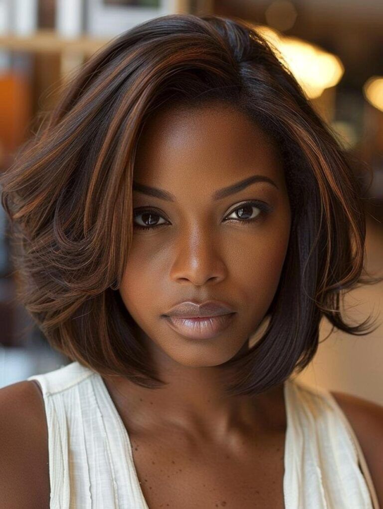 This classic layered bob has a soft side sweep that adds elegance. The layers give light movement and keep the hair from feeling flat. It works well for formal looks and everyday wear. This style suits women who prefer timeless and confident cuts.