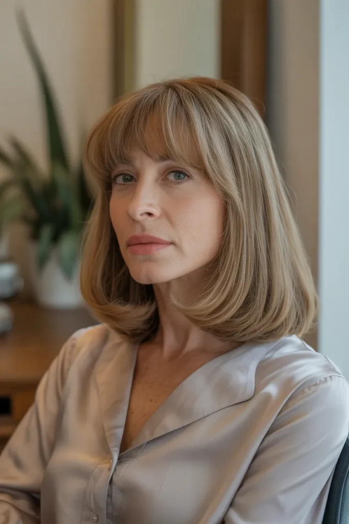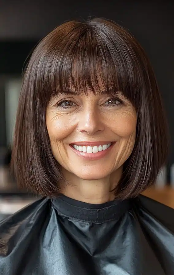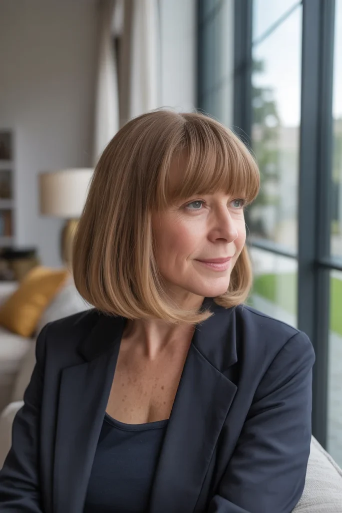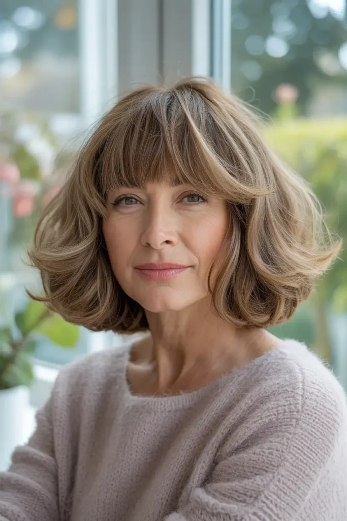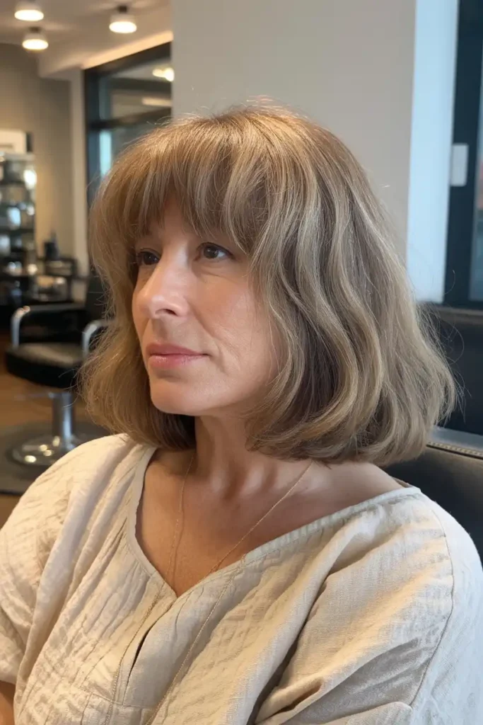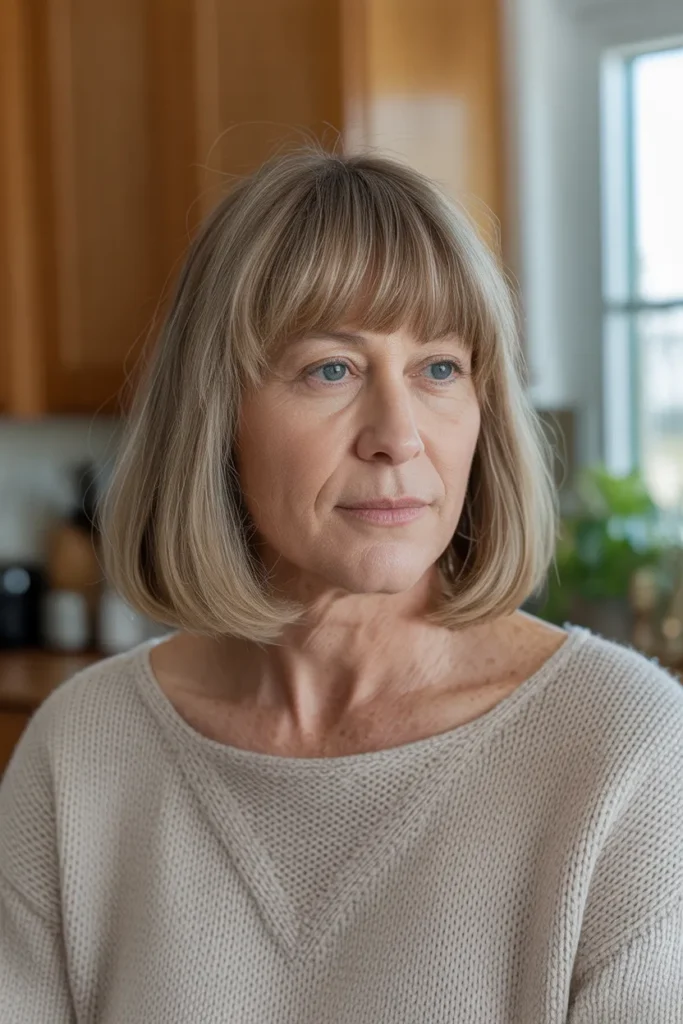 A long bob with a fringe is one of those hairstyles that just works, especially after 50. It feels fresh without trying too hard and gives your face a soft, lifted look. I have seen many women switch to this style and instantly feel more confident.