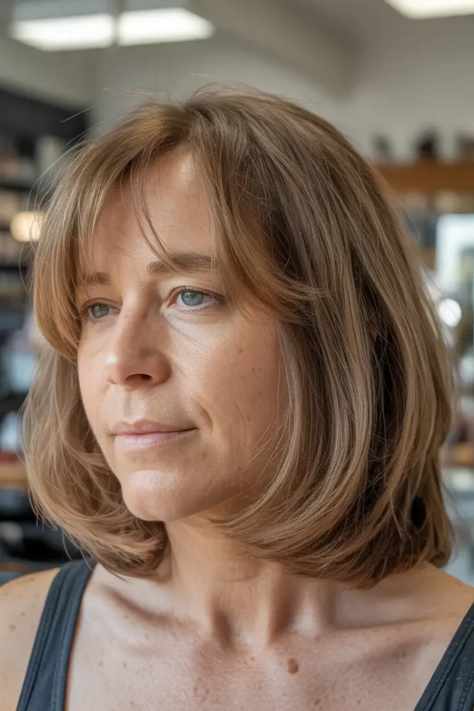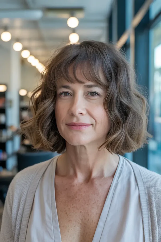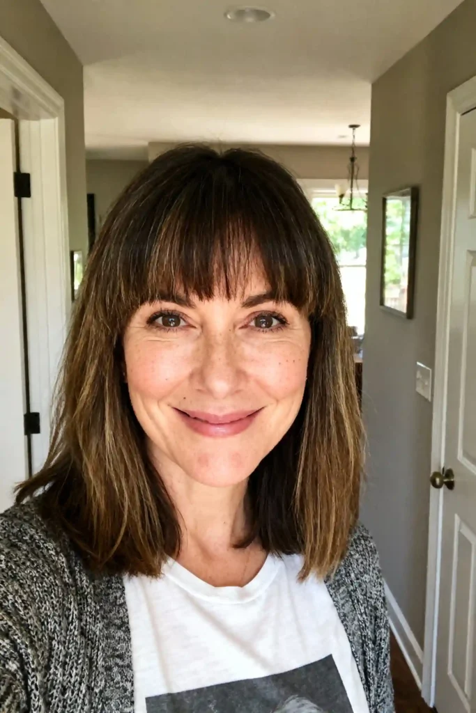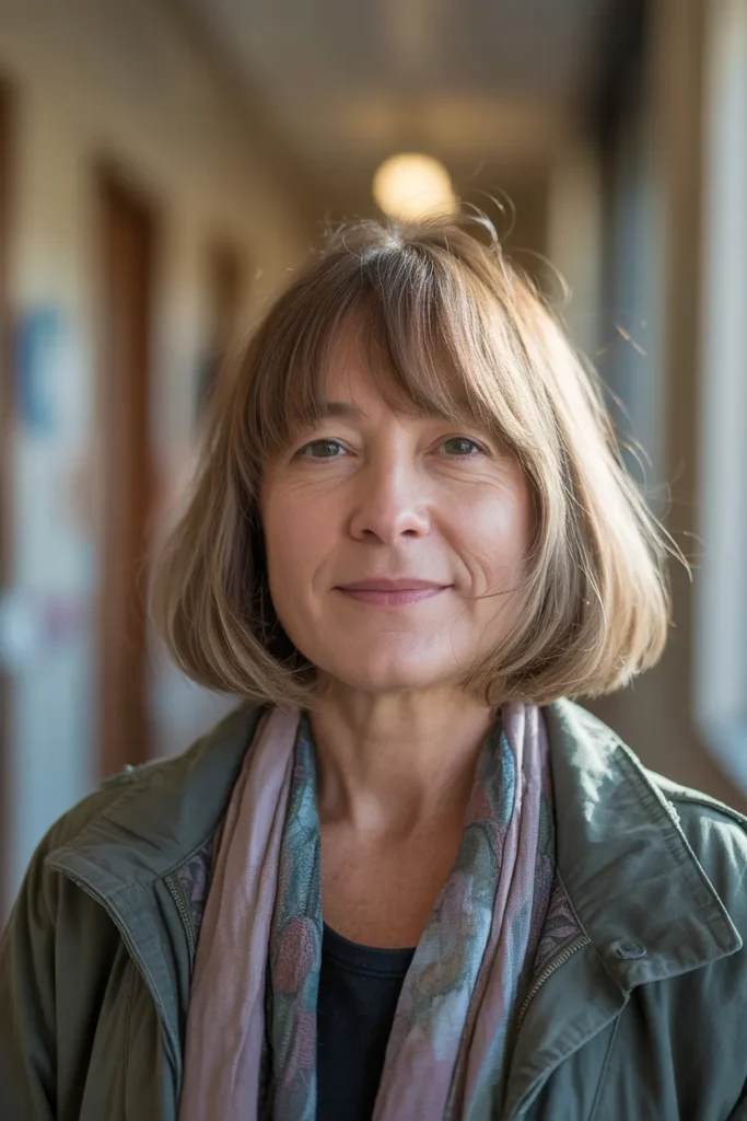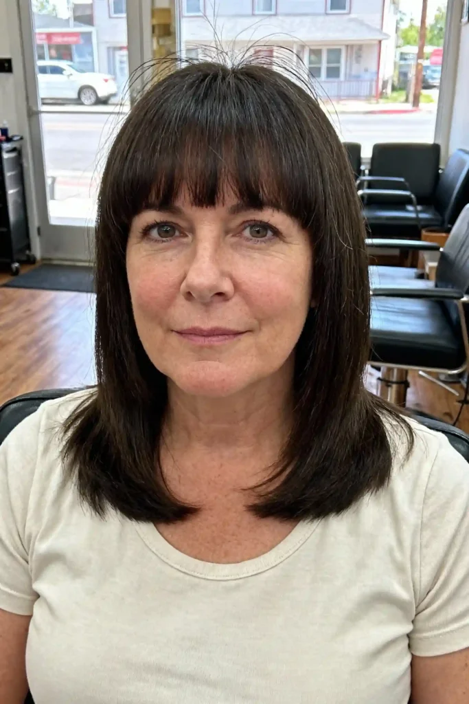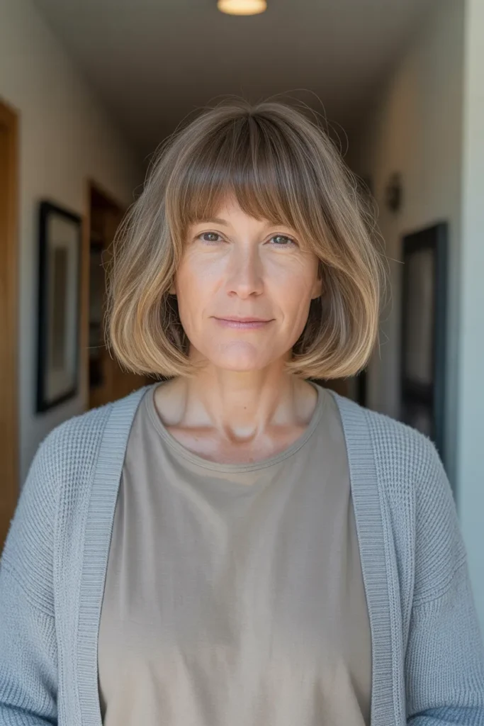A long bob with a fringe is one of those hairstyles that just works, especially after 50. It feels fresh without trying too hard and gives your face a soft, lifted look. I have seen many women switch to this style and instantly feel more confident.