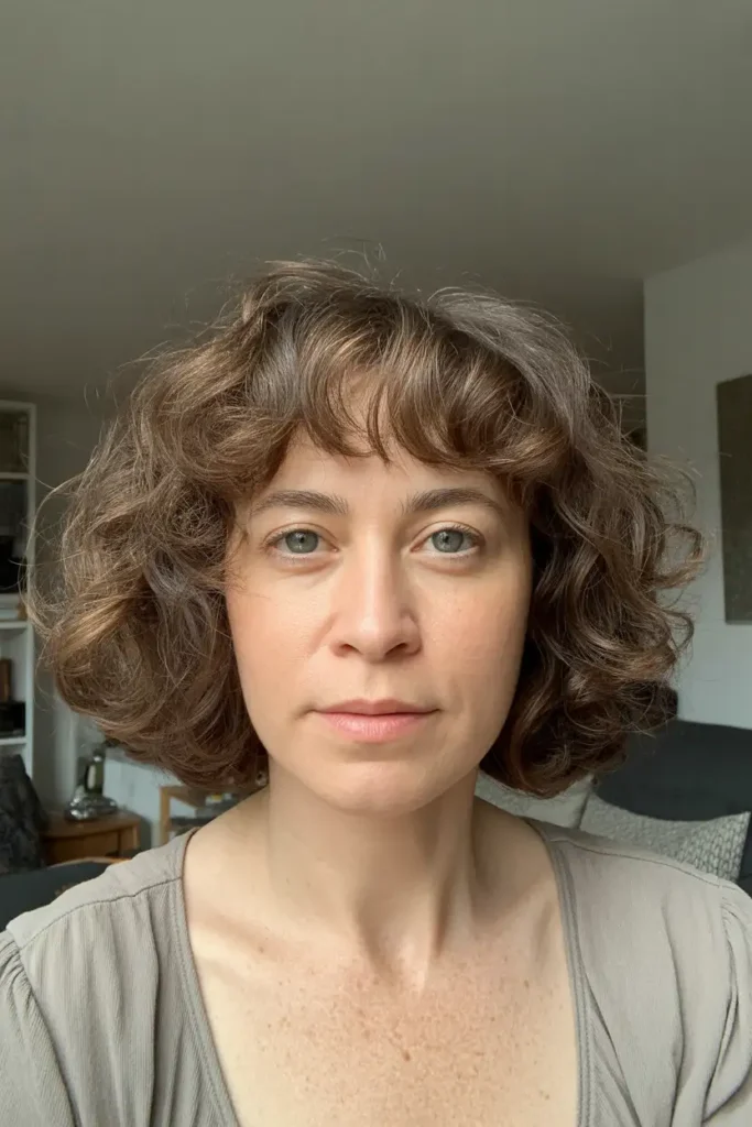 This curly long bob brings texture and personality with a short, soft fringe. The curls give volume while the fringe keeps the look playful and light. It is perfect if your hair has natural movement and you want to embrace it. I like this style because it feels confident and real.