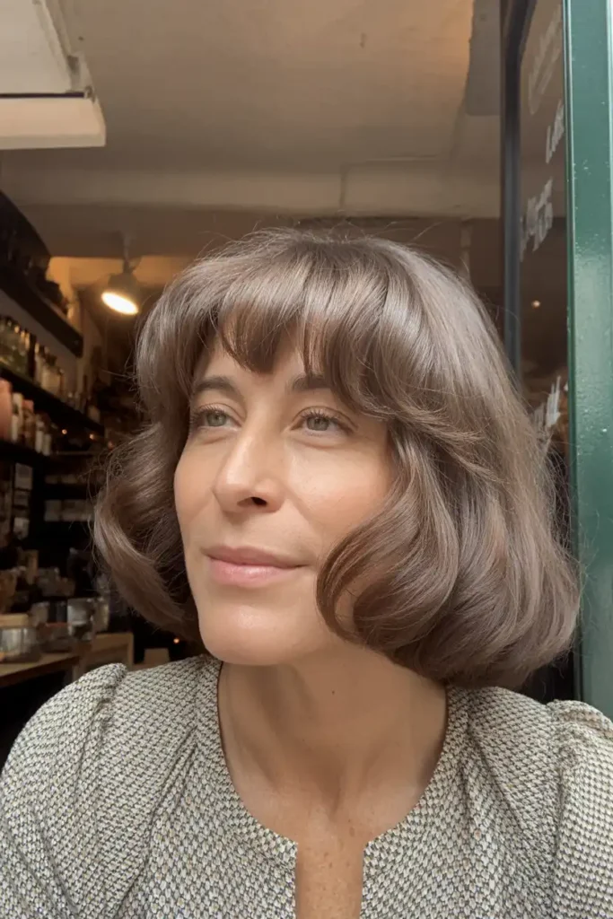 This style brings a classic touch with soft curls and a rounded fringe. The curls give fullness while keeping the length manageable. It feels elegant without looking old fashioned. I like this look for women who enjoy a timeless vibe.