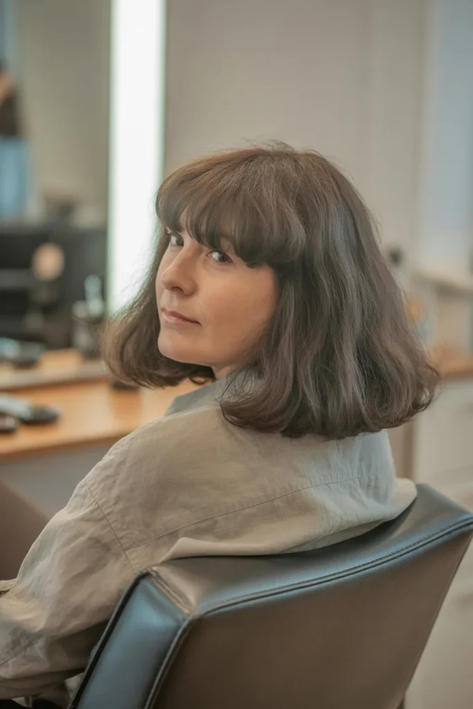 This long bob has a fuller shape with a soft wispy fringe that opens up the face. The cut feels modern but still gentle and wearable. It is perfect if your hair has natural volume. I like how this style frames the eyes without feeling heavy.