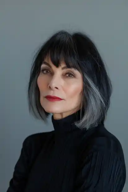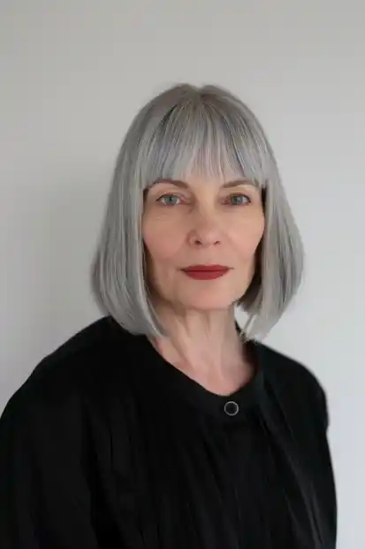 Natural gray hair looks beautiful in this long bob with a soft, wispy fringe. The fringe adds a gentle frame without making the style feel heavy. It feels calm, confident, and very real, not overstyled. This cut is perfect if you want to embrace your natural color with style.
