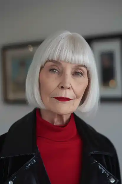 This long bob stands out with a crisp blunt fringe and bright white color. The cut feels bold but very refined at the same time. It frames the face neatly and highlights facial features. I like this look for women who enjoy a confident and striking style.