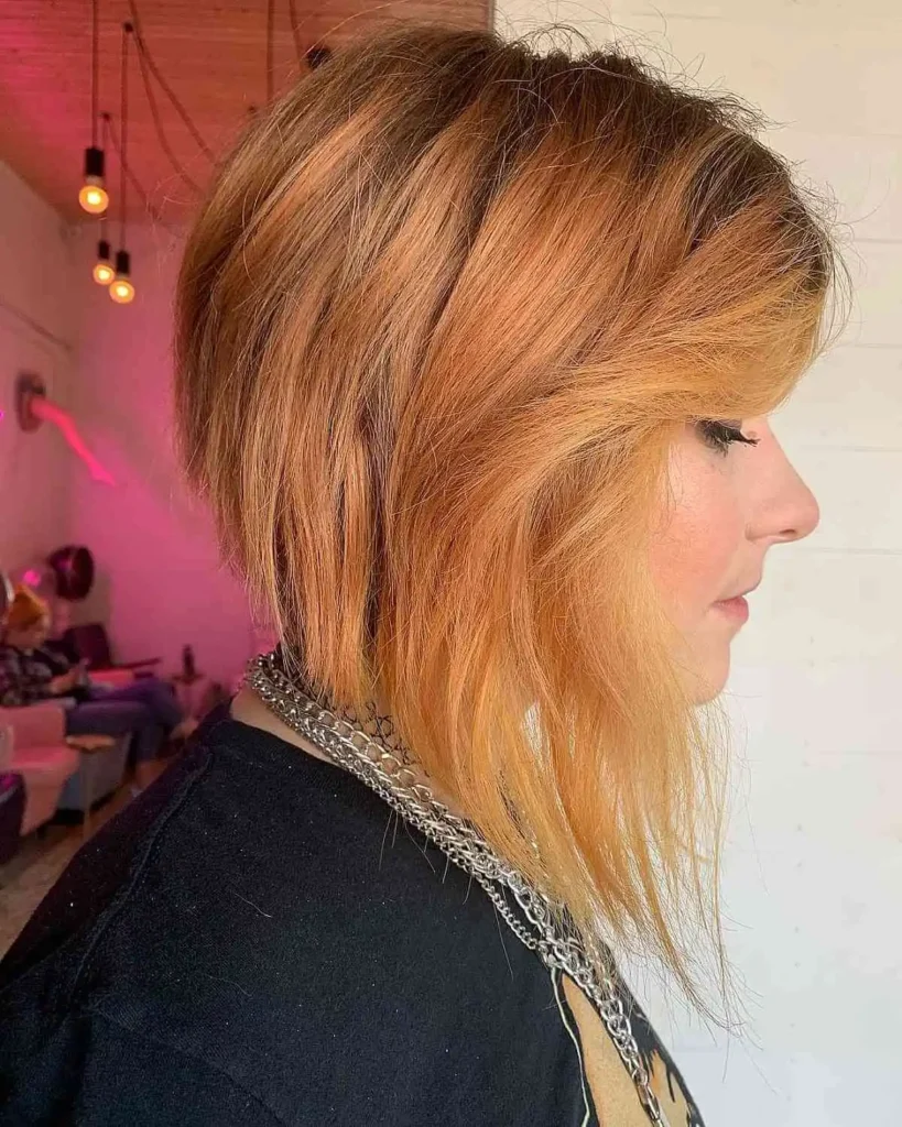 This curly long inverted bob has a warm reddish brown tone that adds personality. The curls bring life to the shape and keep it playful. I love this look because it feels bold but still wearable. It works best when curls are styled softly and not too tight.
