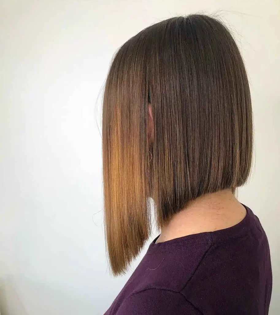 This long and sleek inverted bob focuses on clean lines and shine. The smooth finish highlights the sharp angle of the cut. I love this style for formal or professional settings. It gives a very put together appearance.