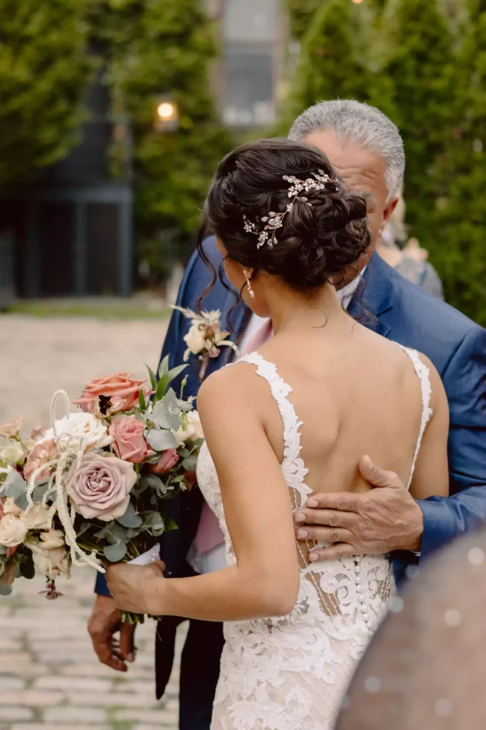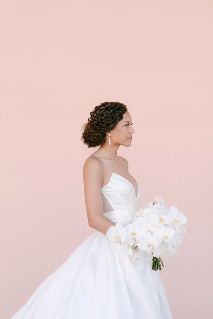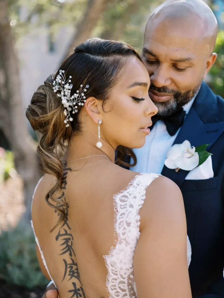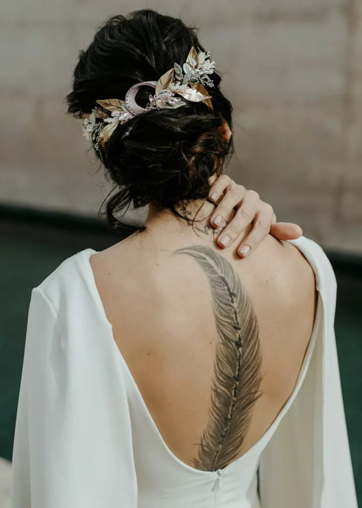 A sleek side part sets the tone, but take a closer look and you’ll see a beautiful balance of polish and undone charm. The asymmetric side bun looks almost as if it’s unraveling, with curly ends and airy spirals that cascade down to highlight the bride’s intricate spine tattoo. It’s stylish, sensual, and full of little details.