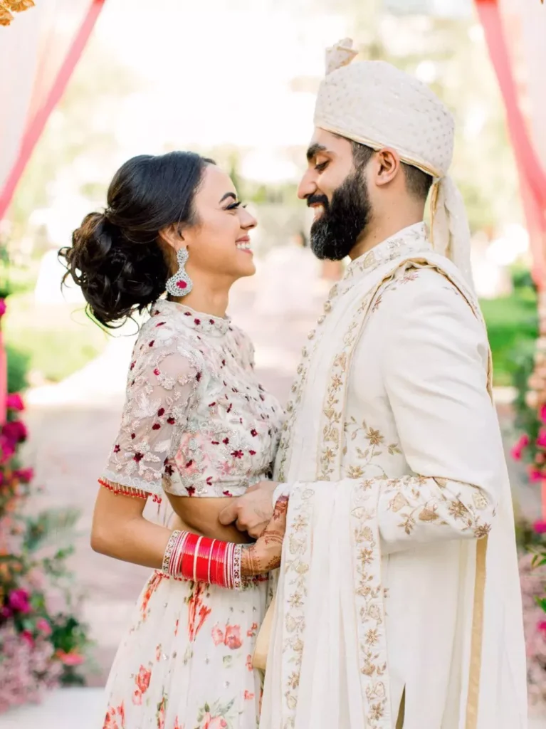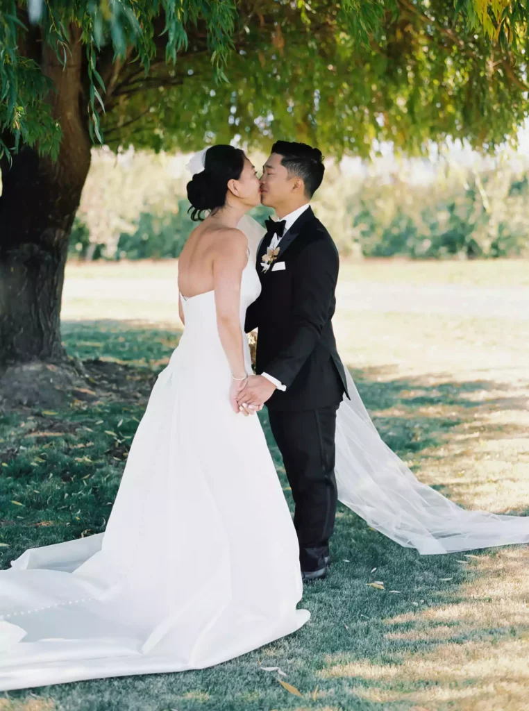This bride styled her hair into an elegant bun tucked at the nape of her neck, but it’s the long, loose tendrils around her face that give it that dreamy, beachy vibe. The free-flowing strands add softness, making the whole look feel relaxed and perfect for a garden party celebration.