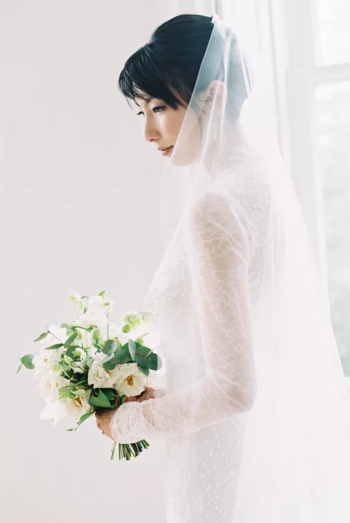 The French twist doesn’t always have to be polished and sleek. This bride softened the classic style by letting her bangs fall freely, creating an undone feel that’s totally modern. According to De Serio, allowing some fringe to hang down brings an instant effortless vibe to an otherwise structured look.