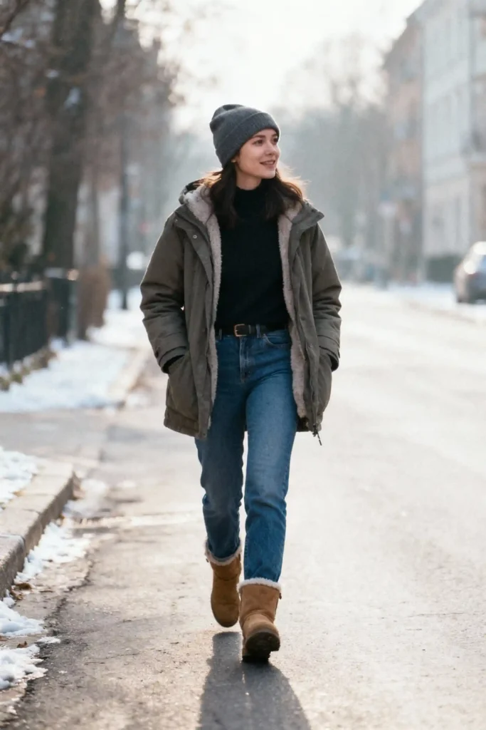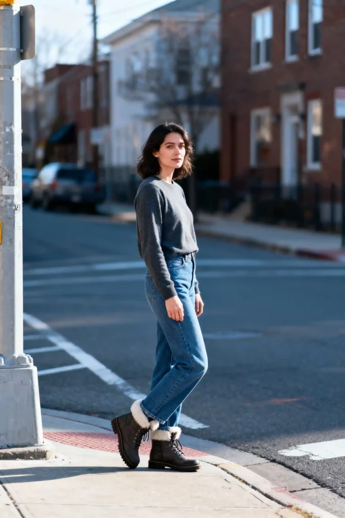 I noticed a lot of straight or relaxed jeans, not tight and not oversized. They looked familiar, like something people trust on cold days. Paired with boots, they felt steady and predictable.