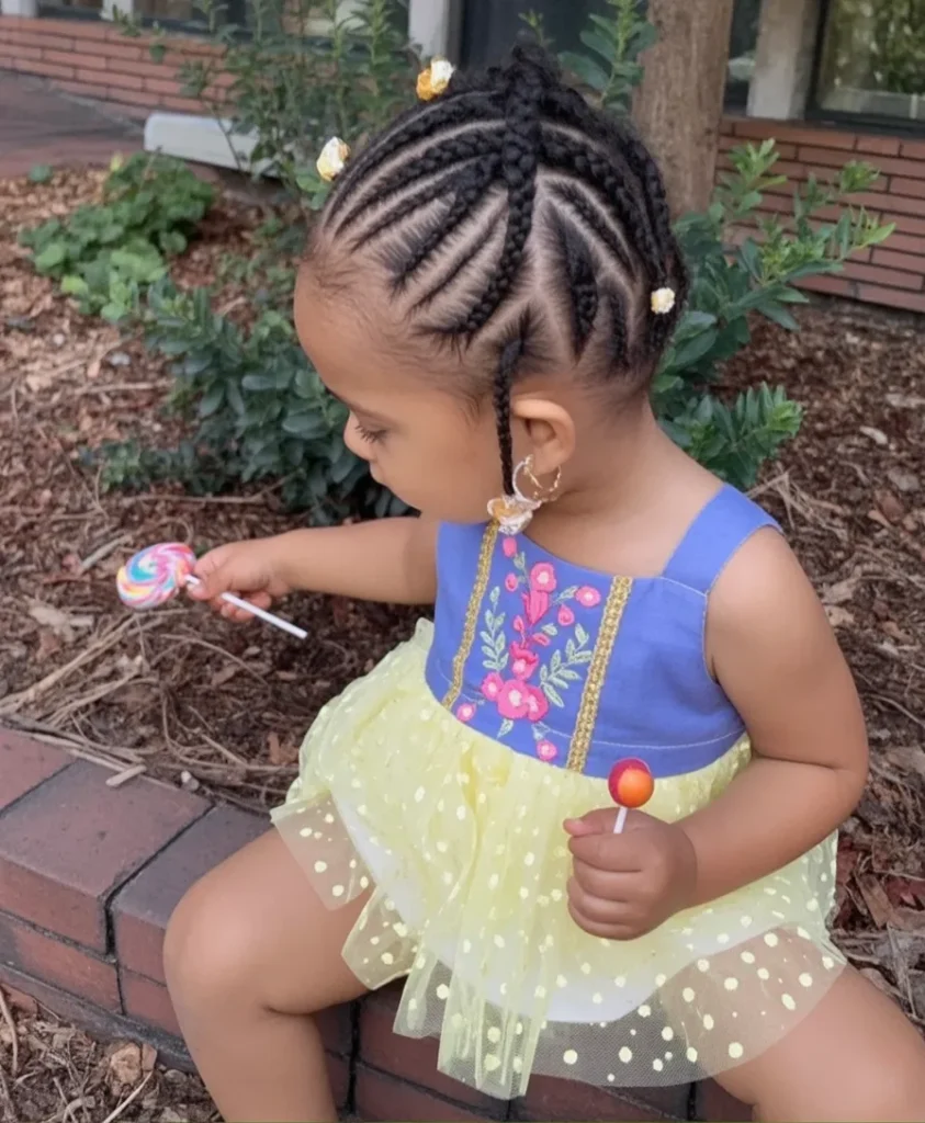 Clean straight back cornrows create a simple and timeless look that feels neat from every angle. Each braid follows a straight line, giving the scalp a smooth pattern that looks calm and balanced. This type of toddler braided hairstyle suits active days since the braids stay close to the head and out of the face.