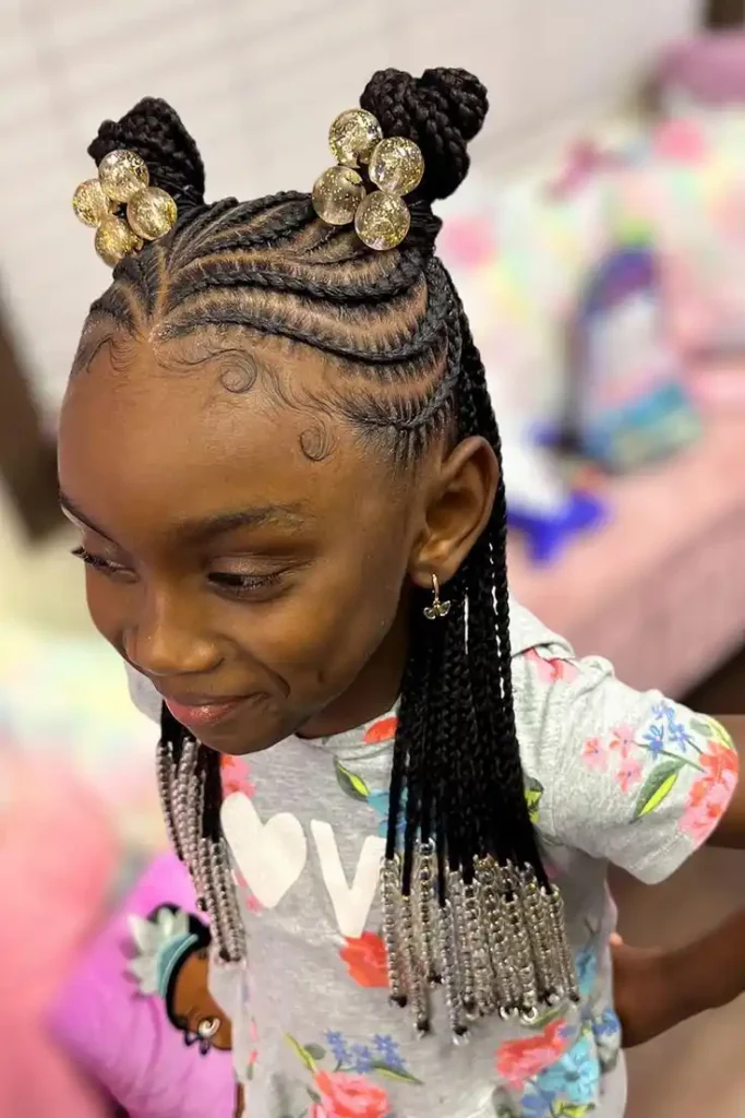 Neat cornrows move upward into two small braided buns, creating a cute lifted shape that feels playful and balanced. Long beaded braids fall from the back, adding soft movement while the top buns keep the front clean and tidy. Gold beads and smooth edges bring a polished look that still feels age appropriate for a toddler.