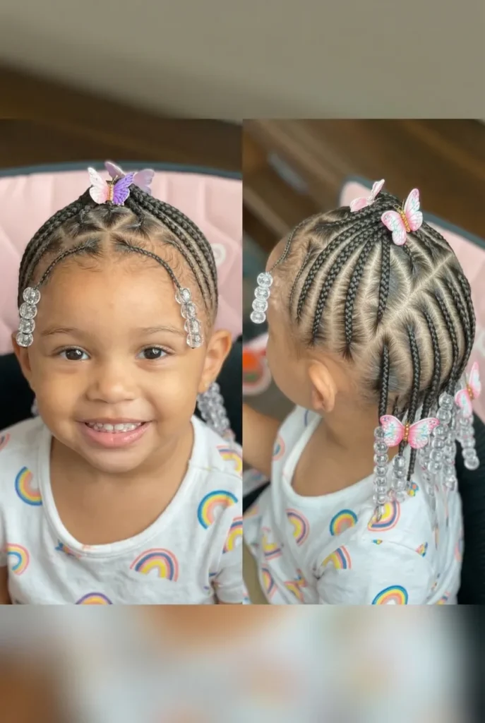 Tiny cornrows curve softly across the scalp, giving this look a playful pattern that feels light and cute for a black toddler girl. The front braids fall gently near the face, while clear beads add a soft shine that moves when she turns her head. Butterfly clips placed on top bring a sweet, fun vibe that many parents love in toddler braided hairstyles.