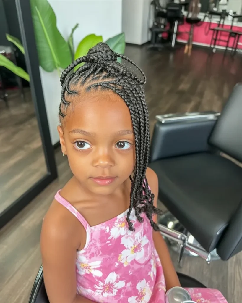 This hairstyle works well for thick natural textures since the braids stay defined and structured. Short hanging pieces keep the look lightweight, which is helpful for everyday play or outdoor moments.
