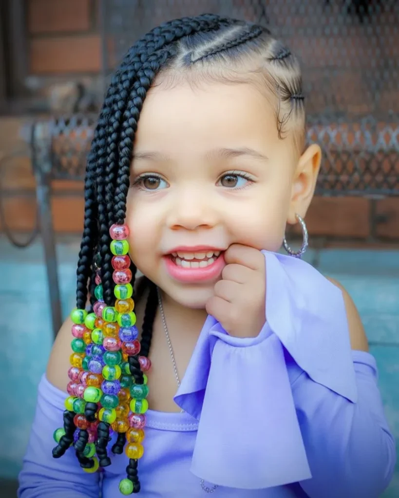 A deep side part brings all the braids toward one side, creating a bold yet playful look that stands out instantly. Thick cornrows start neat at the scalp and flow into long hanging braids filled with colorful beads. The bright bead mix adds fun movement, making this style feel lively and full of personality for a black toddler girl.