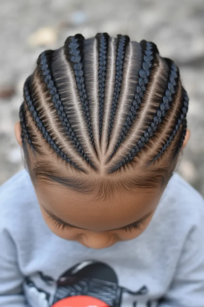 The clean spacing between each braid helps the pattern stay visible without looking too busy. This style suits thick natural textures since the braids stay defined and lightweight for active moments at home or playtime.