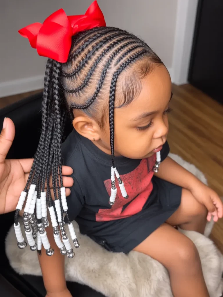 Cornrows curve upward toward a high ponytail, creating a lifted shape that feels fun and full of energy. Long hanging braids flow from the ponytail and finish with white beads that add movement and a playful sound when she walks. A bright red bow at the top gives the style a bold and cheerful touch that stands out easily.