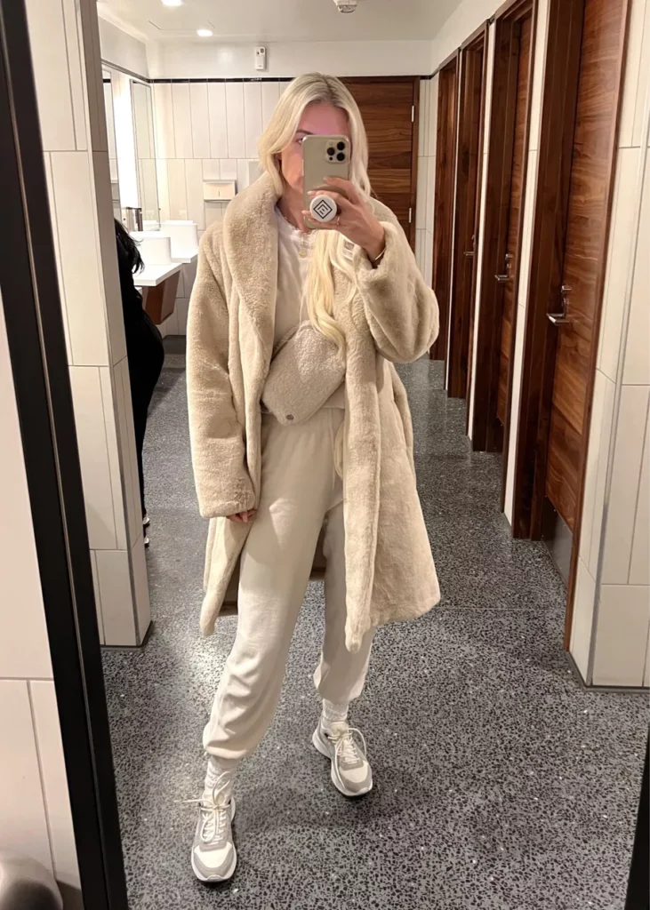For super casual dates like coffee runs or a winter walk, I love a cozy set. A soft sweatsuit paired with a sherpa jacket is comfy but doesn’t look sloppy. I wear mine with clean white sneakers and usually bring a cute crossbody bag.