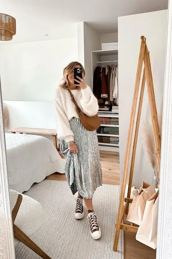 This outfit is perfect if you want to be festive but comfortable. A chunky white knit tucked into a silver sequin midi skirt strikes the right balance. I’d wear this to a cozy dinner at home or a casual party. Sneakers keep it relaxed and wearable.