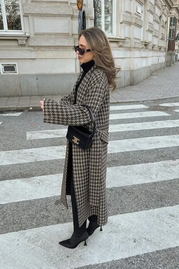 When in doubt, go monochrome. A long printed coat layered over black pants and a black turtleneck looks sharp and clean. Heeled boots give it just enough edge. I like keeping the accessories minimal here to let the coat stand out.