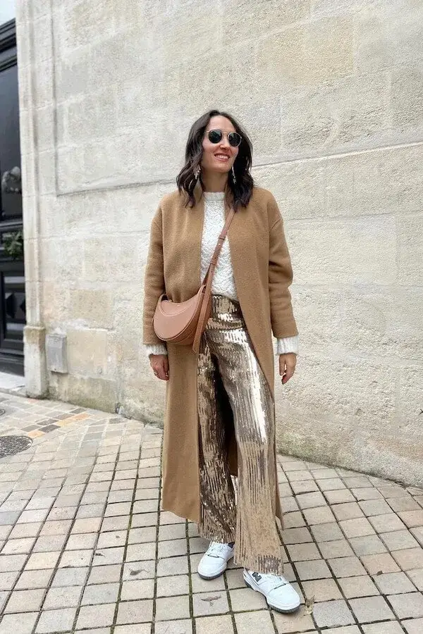 This one’s playful but still polished. Gold sequin pants catch the light and turn heads, but the long camel coat tones it down just enough. A cream knit and white sneakers make the outfit feel grounded and not too dressy. It’s perfect for dates around the holidays.