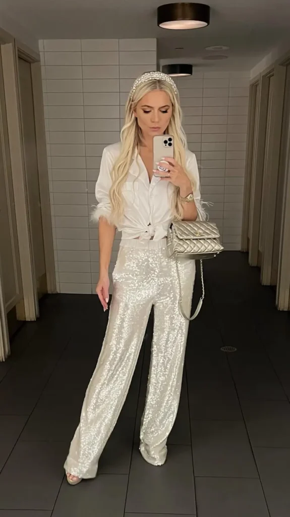 If you’re heading somewhere a little more dressed up or it’s close to the holidays, this outfit is fun and different. Sequin pants bring energy to the look, and a festive blouse keeps it classy. Add simple heels or a sparkly headband if you’re feeling bold.