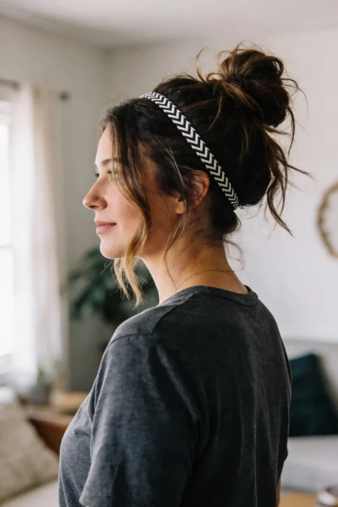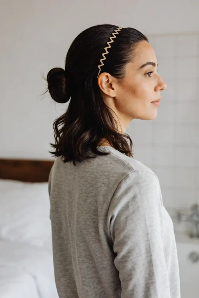 If you love a messy bun moment, this one’s for you. Just toss your hair up like usual and pop on a zig zag headband to instantly make it look intentional. Leave a few face framing pieces out for that undone, effortless look that still feels styled.