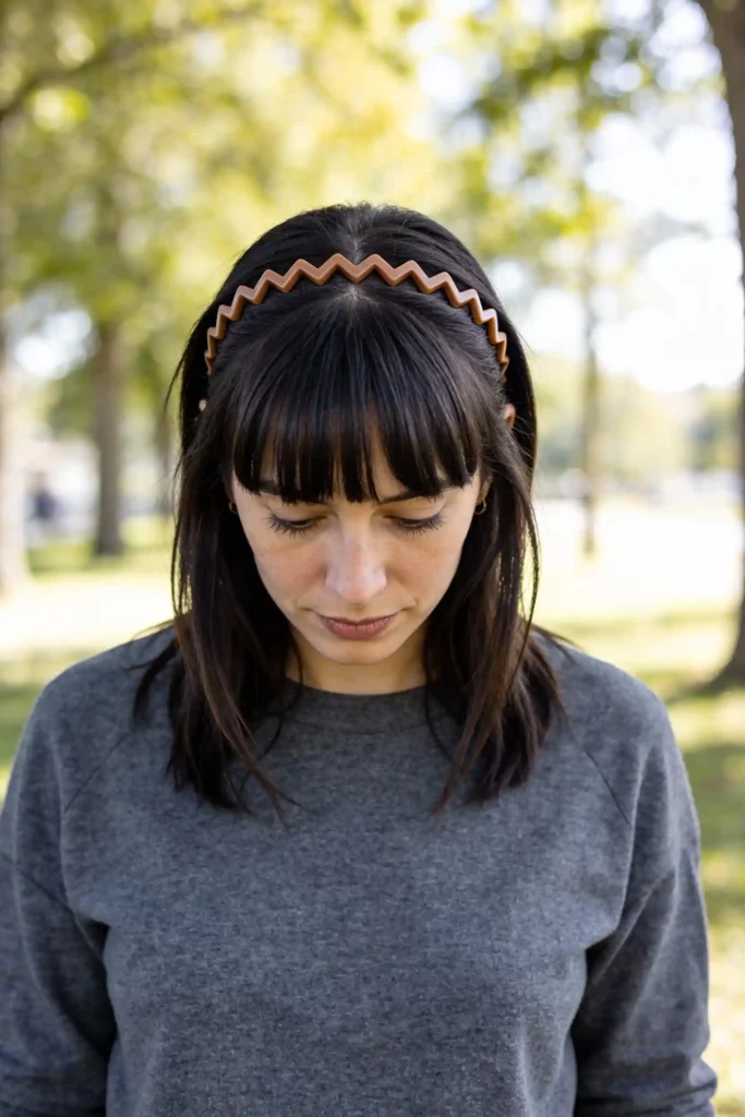 Curtain bangs already have that soft, face-framing vibe, and a zig zag headband only makes them look better. Slide the headband just behind your bangs so they fall naturally while the rest of your hair is pushed back. It’s a simple way to style your hair without hiding your bangs or messing up their shape.