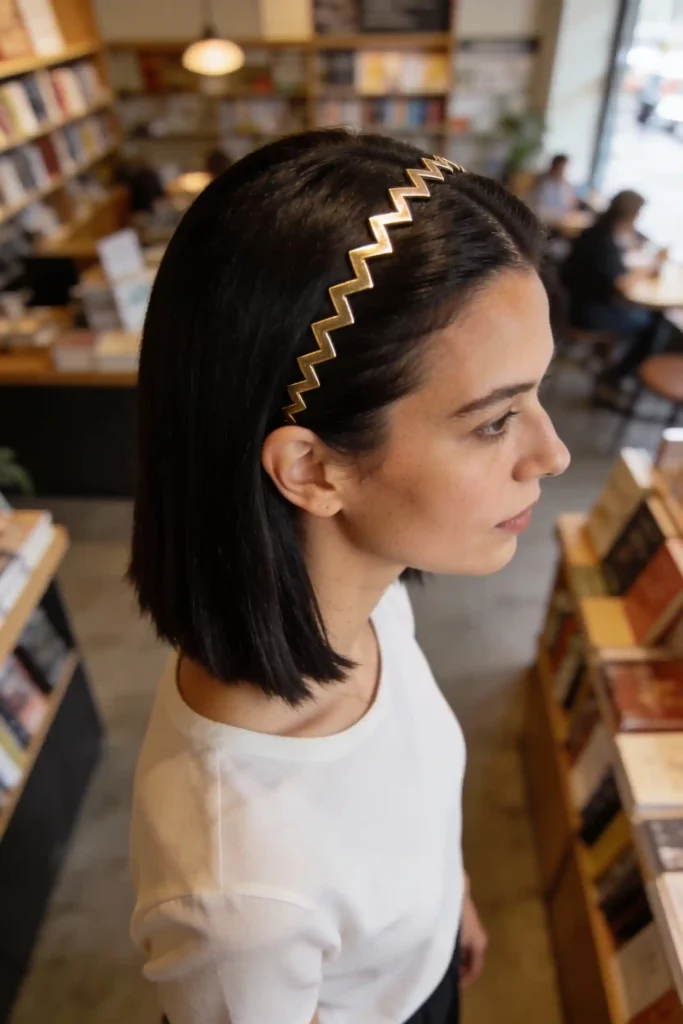 Short hair absolutely works with this trend. If you have a bob or lob, adding a zig zag headband instantly gives it a fresh and edgy touch. Whether you style your hair sleek and straight or with soft waves, the headband helps frame your face and adds just enough detail to keep the look interesting.
