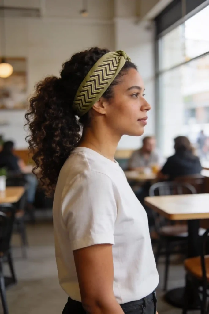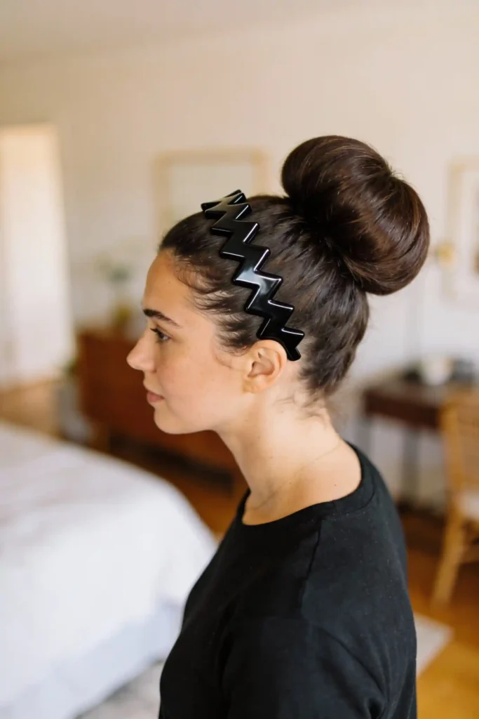 Throw your hair into a high top knot, then slide on a zig zag headband for a look that’s equal parts clean and playful. This combo gives off major retro energy and works especially well when you want your face to be the focus. Add a bold lip or statement earrings to take it up a notch.